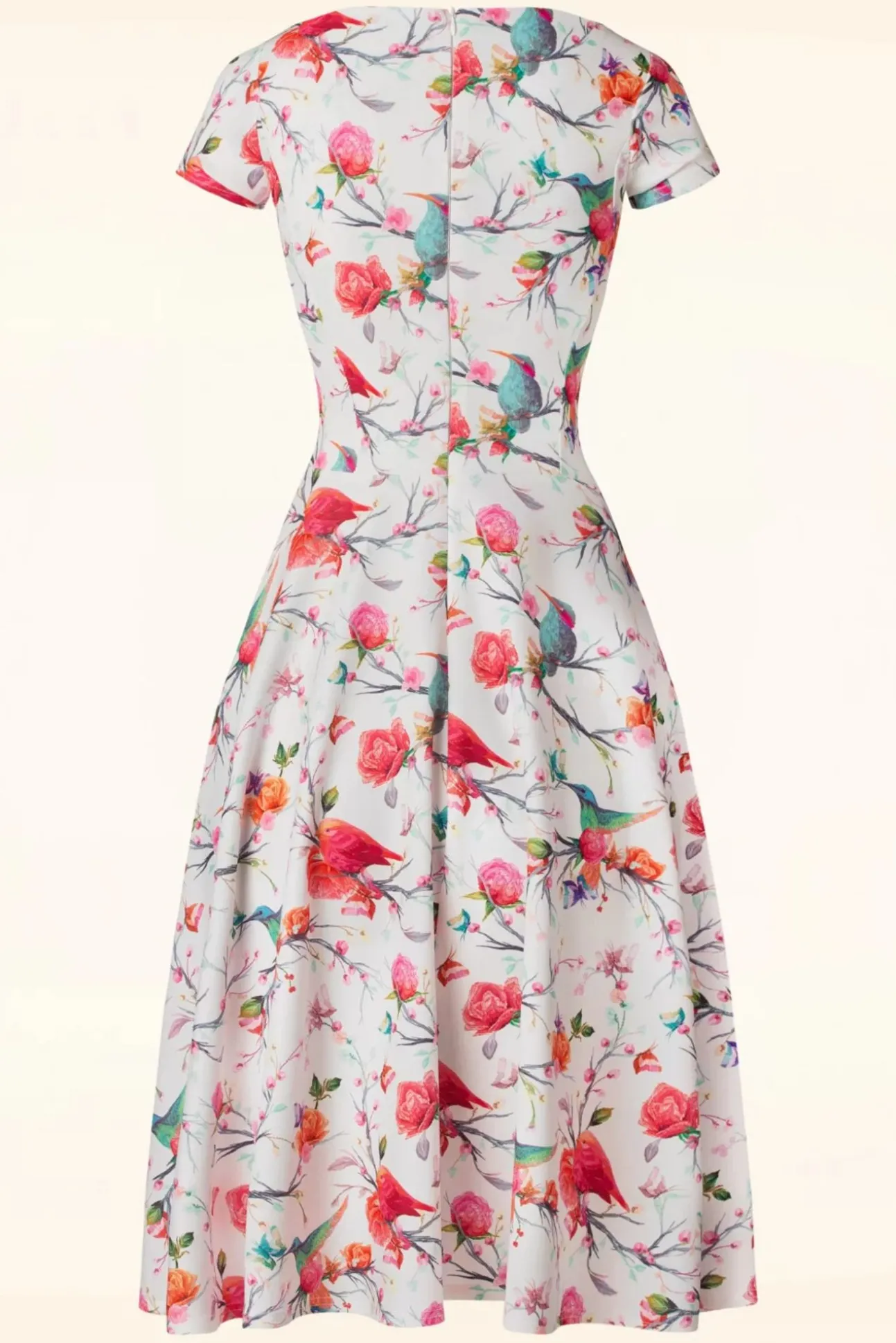 Wij Krijgen Lentekriebels Van Deze Blythe Birds Swing Dress In White! Ze Heeft Een Elegante Boothals, Korte Mouwen En Loopt Vanaf De Taille Uit In Een Zwierige Swing Rok. Uitgevoerd In Een Soepel En Stretchy, Wit Stofje Dat Heerlijk Draagt En Voorzien Is Van Een Kleurrijke Print Met Bloemen En Vogeltjes. Voel Jij Al Kriebels In Je Buik? 😉