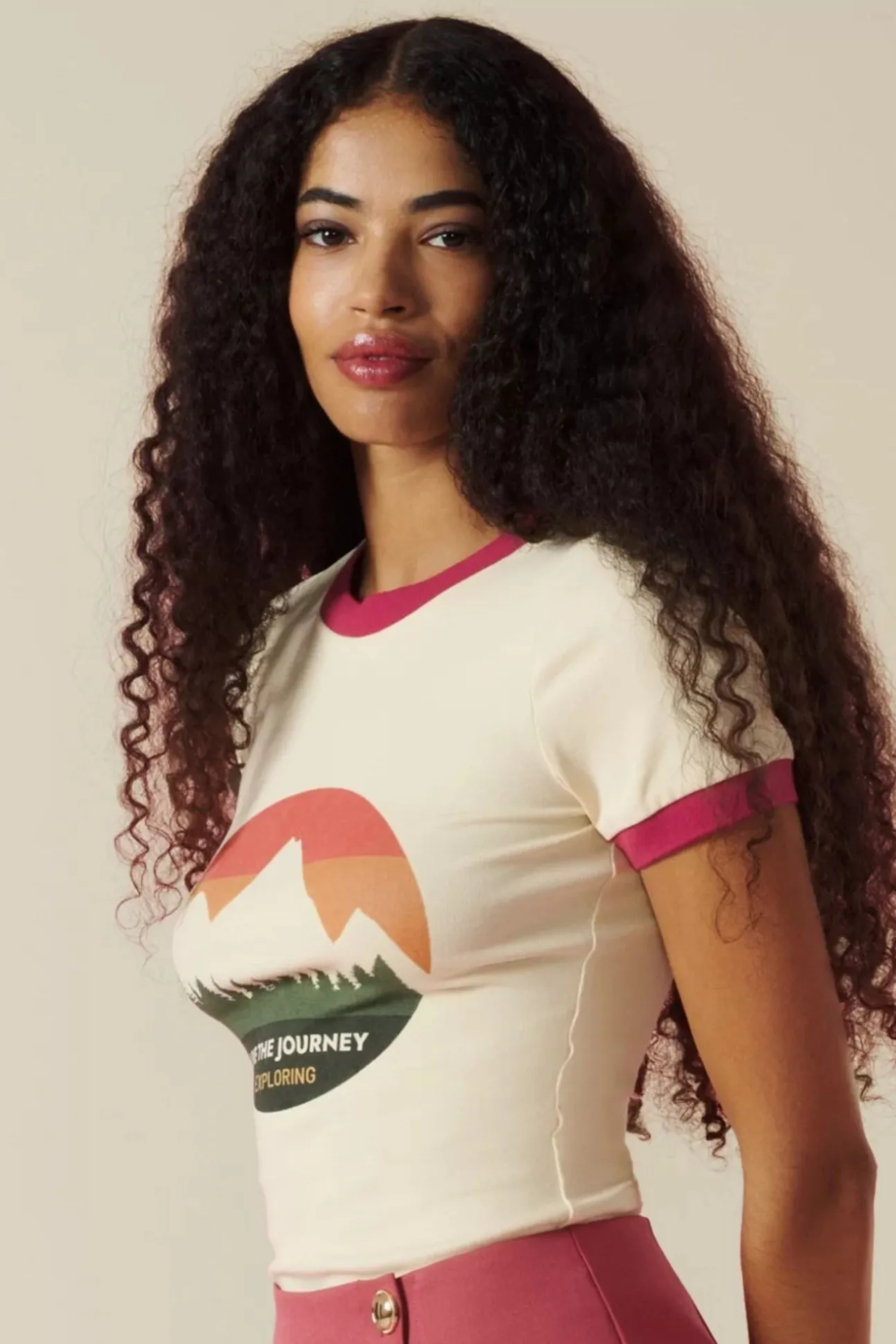Nieuwe Lente/Zomercollectie ~ ”Go Outside And Explore!” Dit T-Shirt Is Uitgevoerd In Een Luchtige, Stretchy Ecrukleurige Katoenmix Met Een Seventies Print En Framboosrode Biesjes.