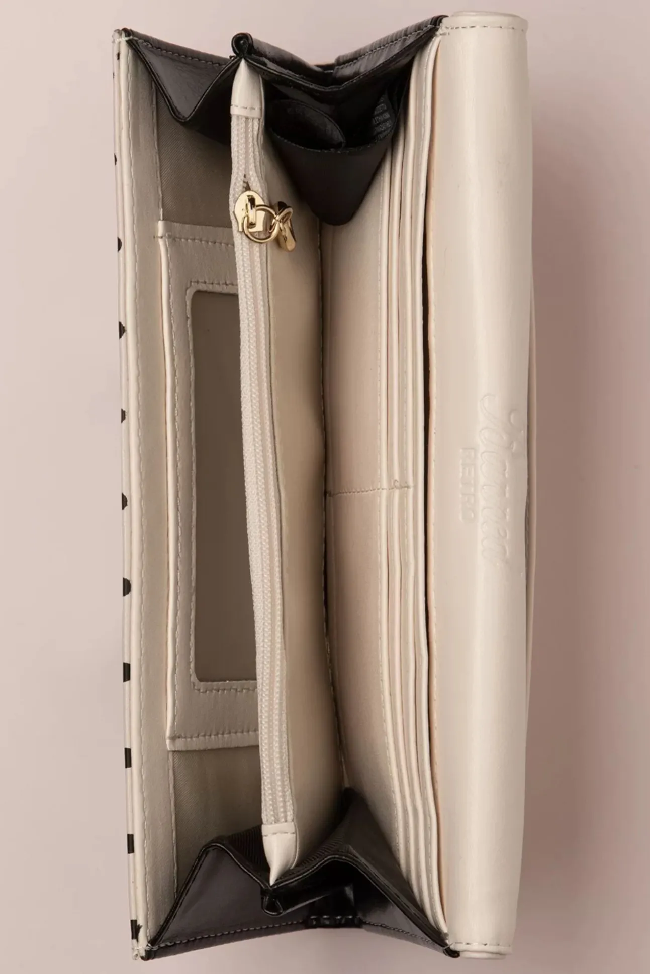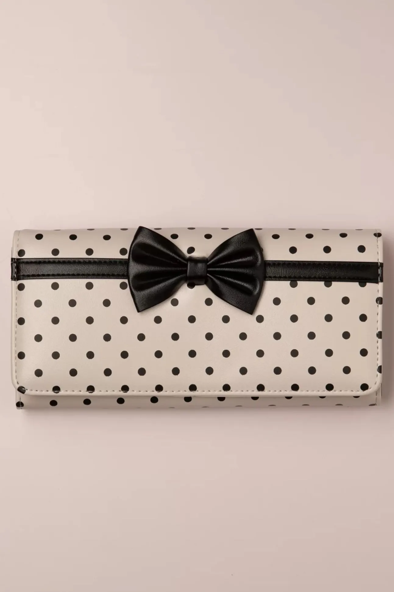 Deze 50S Carla Wallet In Sand And Black Is Een Echte Klassieker Met Haar Prachtige Kleurcombinatie En Het Kleine, Zwarte Strikje! Ze Is Gemaakt Van Een Stevige, Mooie Kwaliteit Zandkleurig ‘Faux’ Leder Met Een Print Van Zwarte Polkadots. Een Ruim Model Met Aan De Binnenzijde Een Extra Verdeelvak Met Ritssluiting Voor Kleingeld, Ruimte Voor 12 Pasjes En Pasfoto’s En 2 Open Vakjes Voor Bonnetjes Of Briefgeld. Afgewerkt Met Een Drukknoopje Zodat Je Centjes Veilig Opgeborgen Zijn! Classy, Handig En Veilig; Wat Wil Je Nog Meer?!