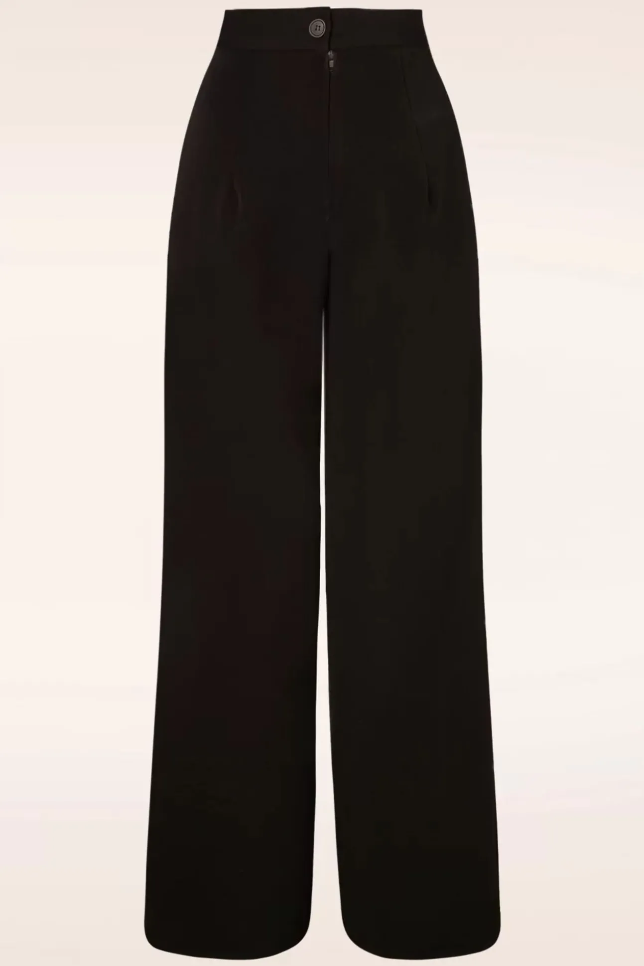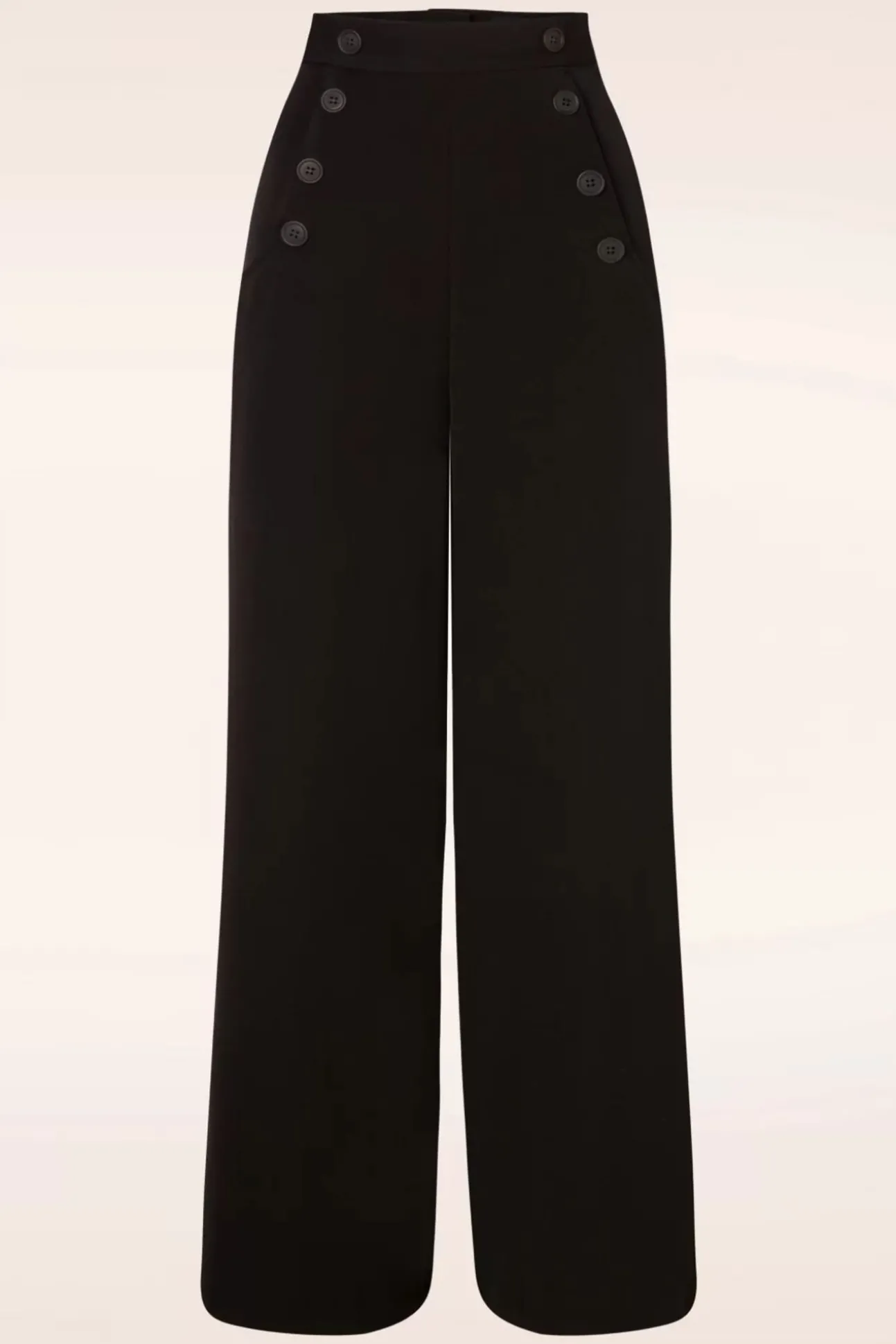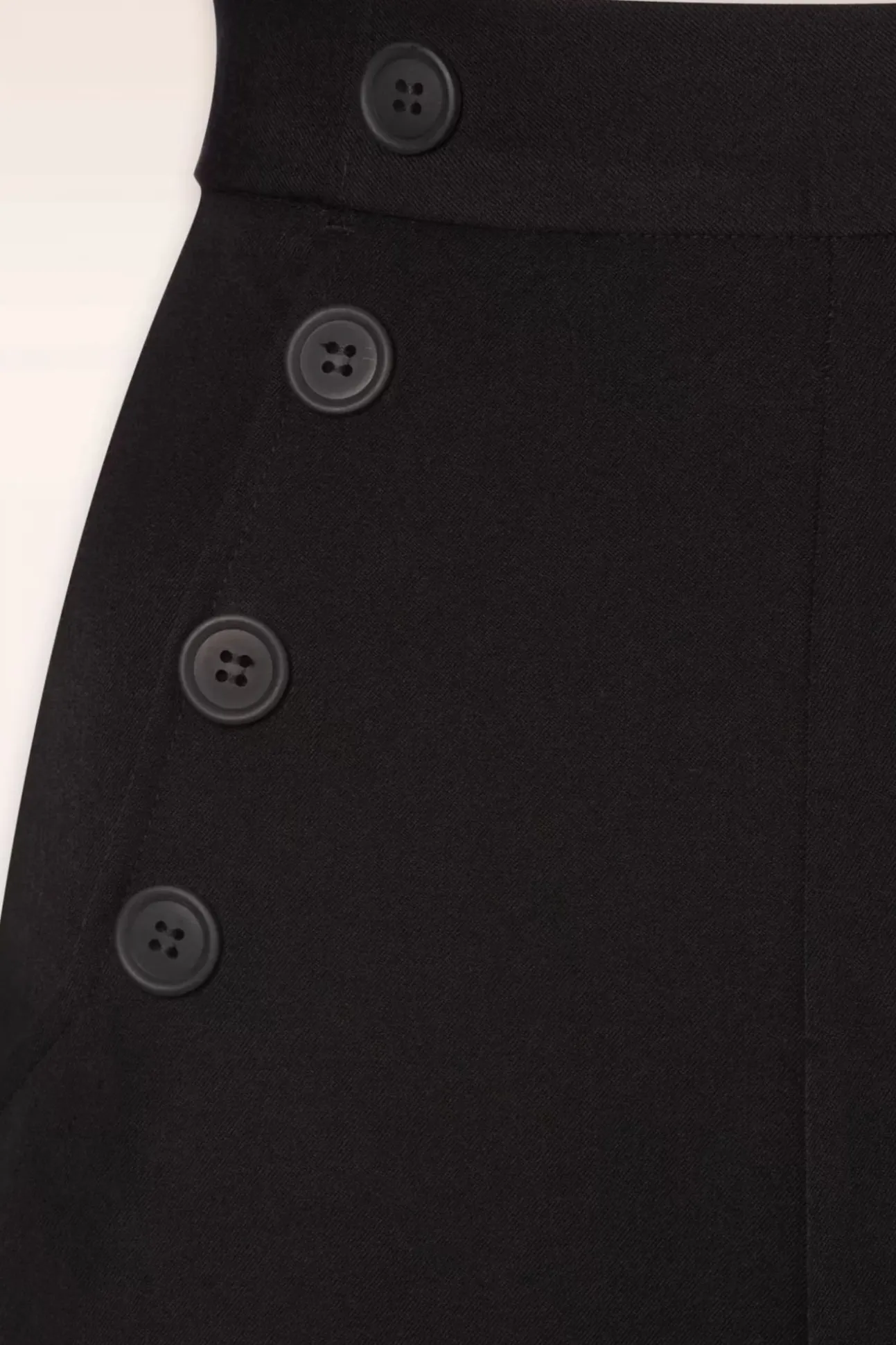 “Looking For A Statement Trouser To Add To Your Everyday Wardrobe?” Dan Is Deze 40S Carlie Swing Trousers In Zwart Echt Iets Voor Jou! Ze Brengt Met Haar Vrouwelijke Hoge Taille, Charmante Sierknopen En Elegante Wijde Pijpen Fourties ‘swing’ In Je Garderobe ;-). Ze Is Uitgevoerd In Een Soepelvallende, Zwarte Stof Met Een Lichte Stretch Die Verrassend Comfy Draagt. Klaar Om Een Statement Te Maken?
