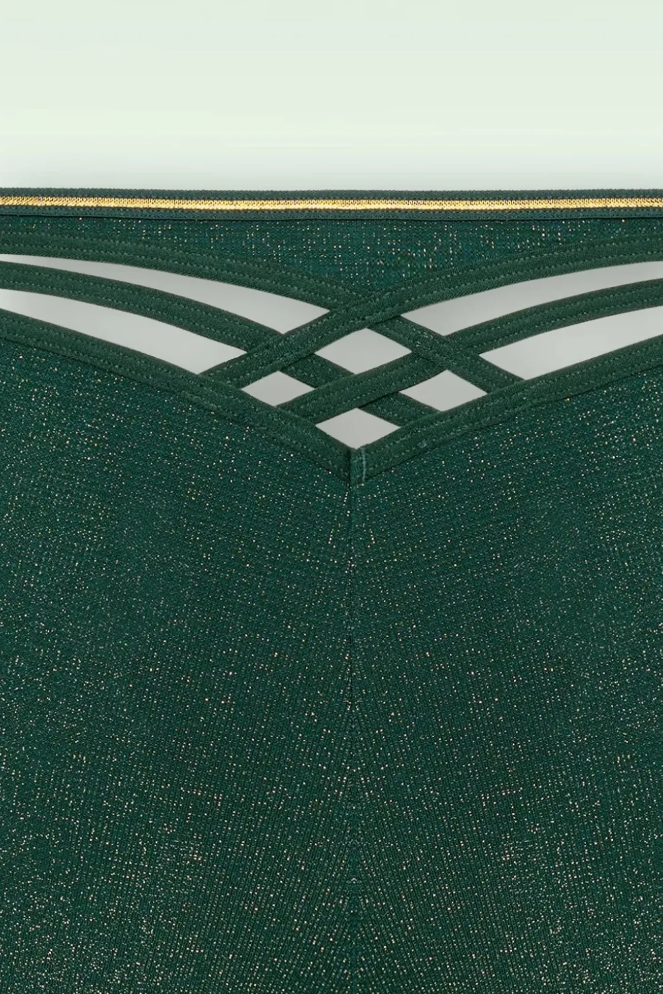 ‘Dare To Be Seen’ In Deze Dame De Paris High Brazilian Brief In Green And Gold! Ze Is Uitgevoerd In Een Stretchy Dennengroene Stof Met Een Subtiele Gouden Lurex Glitter En Een Prachtig Lijnenspel Op De Achterkant Van Het Broekje! Marlies Heeft Zich Bij Het Ontwerpen Van Deze Collectie Laten Inspireren Door De Glorieuze Notre Dame-Kathedraal En Tijdgenoot Hildegard Von Bingen.