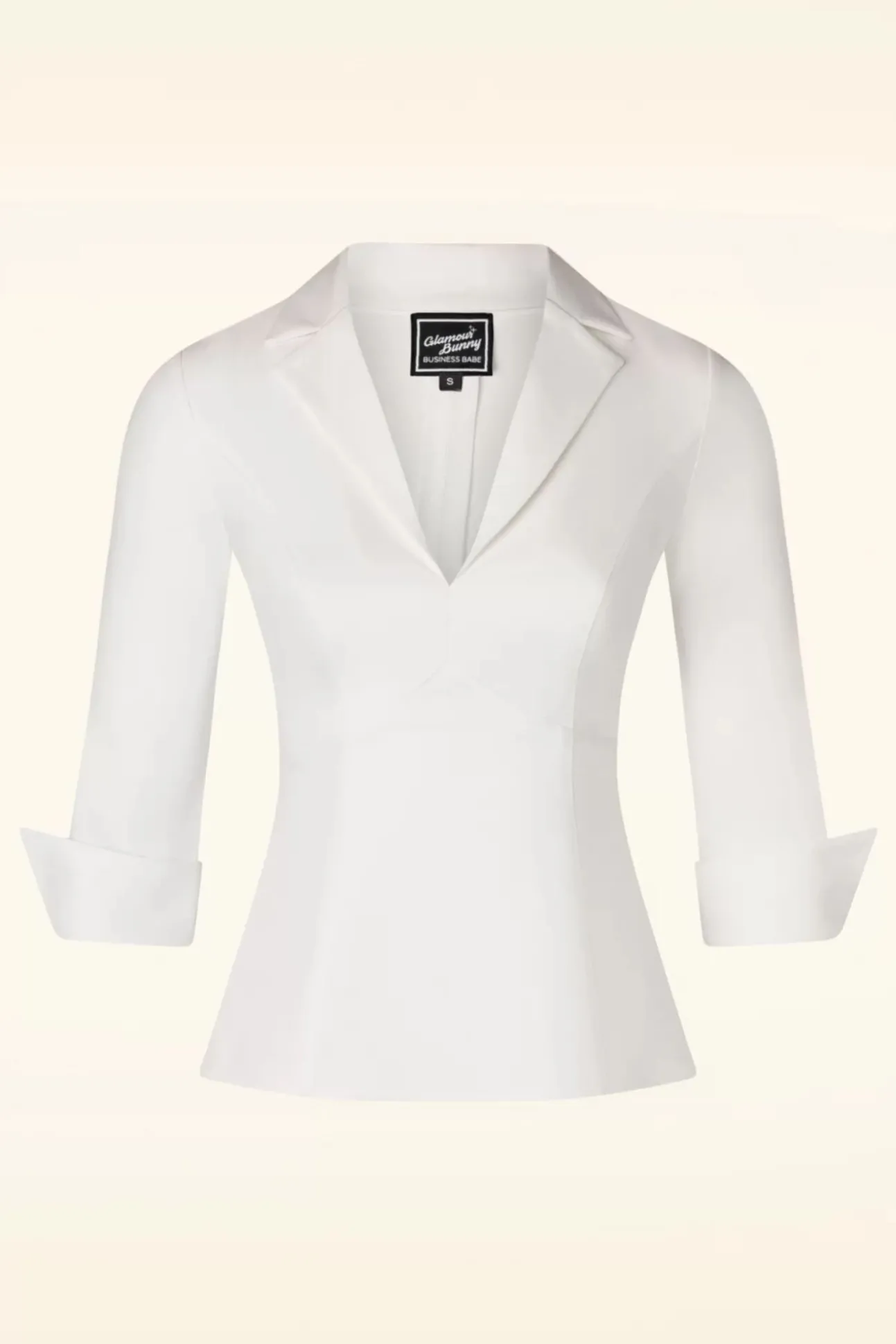 ‘Dress How You Want To Be Addressed! ‘Boss Lady’ Will Do Just Fine!’ 😉 Jij Hebt De Touwtjes In Handen Als Je Deze Veelzijdige 50S Dianne Blouse In Crispy White Draagt! Ook Dit Seizoen Hebben Onze Getalenteerde In-House Designers Zich Wederom Laten Inspireren Door De Ambitie En Het Doorzettingsvermogen Van Onze Eigen Boss Lady Angelique Die Al Haar Dromen Waarmaakt…”That’s What We Call Women Empowerment!” Deze Licht Getailleerde Classy Blouse Heeft Het Comfort Van Een Top En Is Afgewerkt Met Een Puntig Revers Kraagje En 3/4 Mouwtjes Met Puntige Omslagjes. Uitgevoerd In Een Stevige Maar Toch Soepele Ivoorwitte Stof Met Een Hele Lichte Stretch Die Heerlijk Draagt! Match Dianne Met Een High Waist Pantalon Of Pencil En High Heels Voor Een ‘Effortless Glam’ Look Waar Style Icon Lauren Bacall Om Bekend Stond! Laten We Vooral Deze Quote Van Haar Nooit Vergeten: ”I Am Not A Has-Been. I Am A Will Be!” En Zo Is Het Maar Net, Hunnie 😉