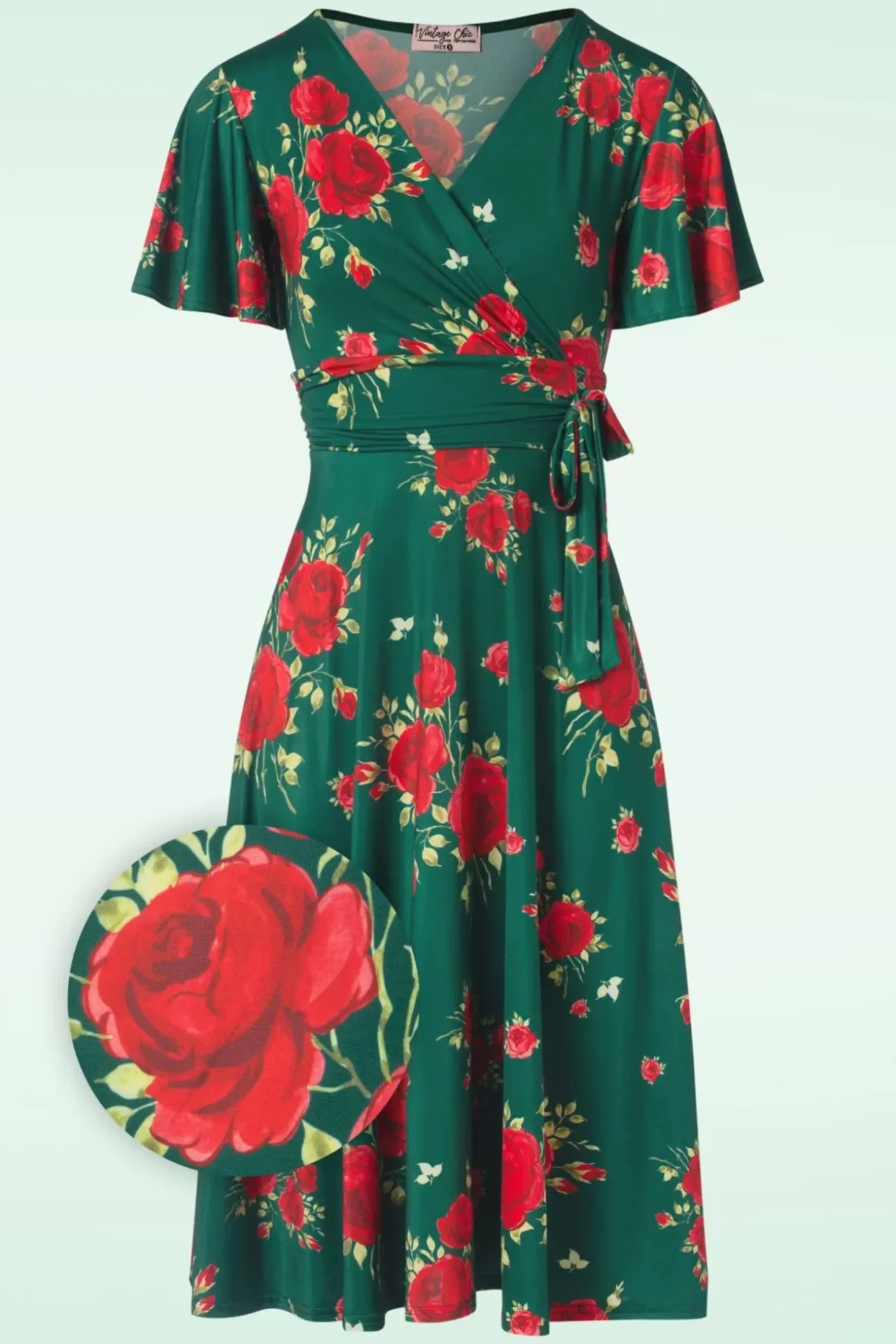 Hoe Mooi Is Deze Irene Flower Cross Over Swing Dress In Silky Green?! Ze Laat Je Op En Top Vrouw Voelen Door De Prachtige Aansluitende Overslag Top Met Een Sexy V-Halslijn, Speelse Strikbandjes Die Je Zowel Los Als Gestrikt Kunt Dragen En Haar Flatterende Plooien In De Taille. De Zwierige Vlindermouwtjes Geven Haar Een Flirty Touch Terwijl De Flatterende Semi-Swing Rok Zorgt Voor Een Flinke Portie Elegantie, Wow! Ze Is Uitgevoerd In Een Glad En Soepel, Licht Glanzend, Donkergroen, Stretchy Stofje Bezaaid Met Prachtige Rode Rozen, Dat Garant Staat Voor Veel Kreukvrij Draagplezier. Irene Is Liefde, Pure Jurken-Liefde!