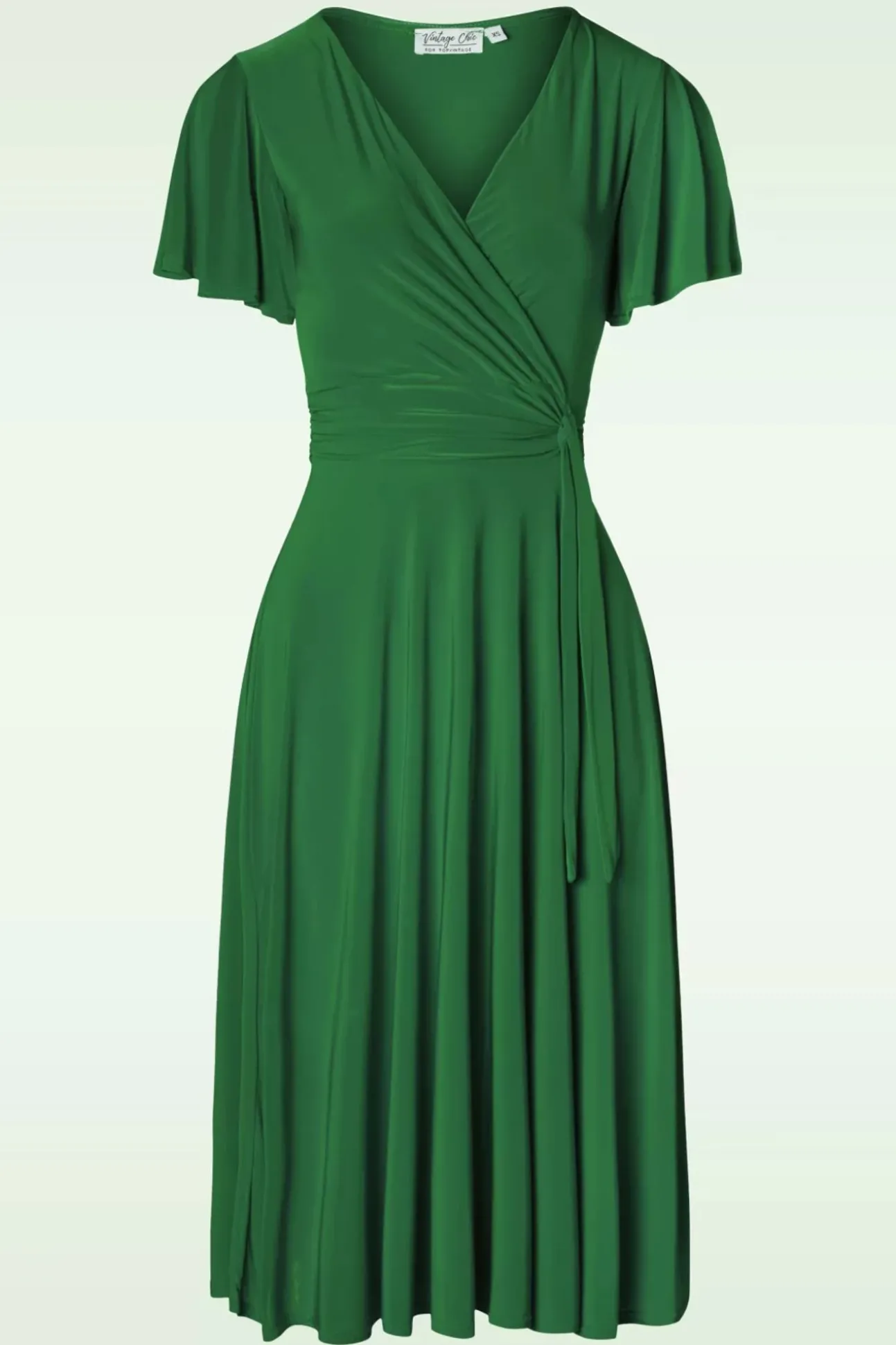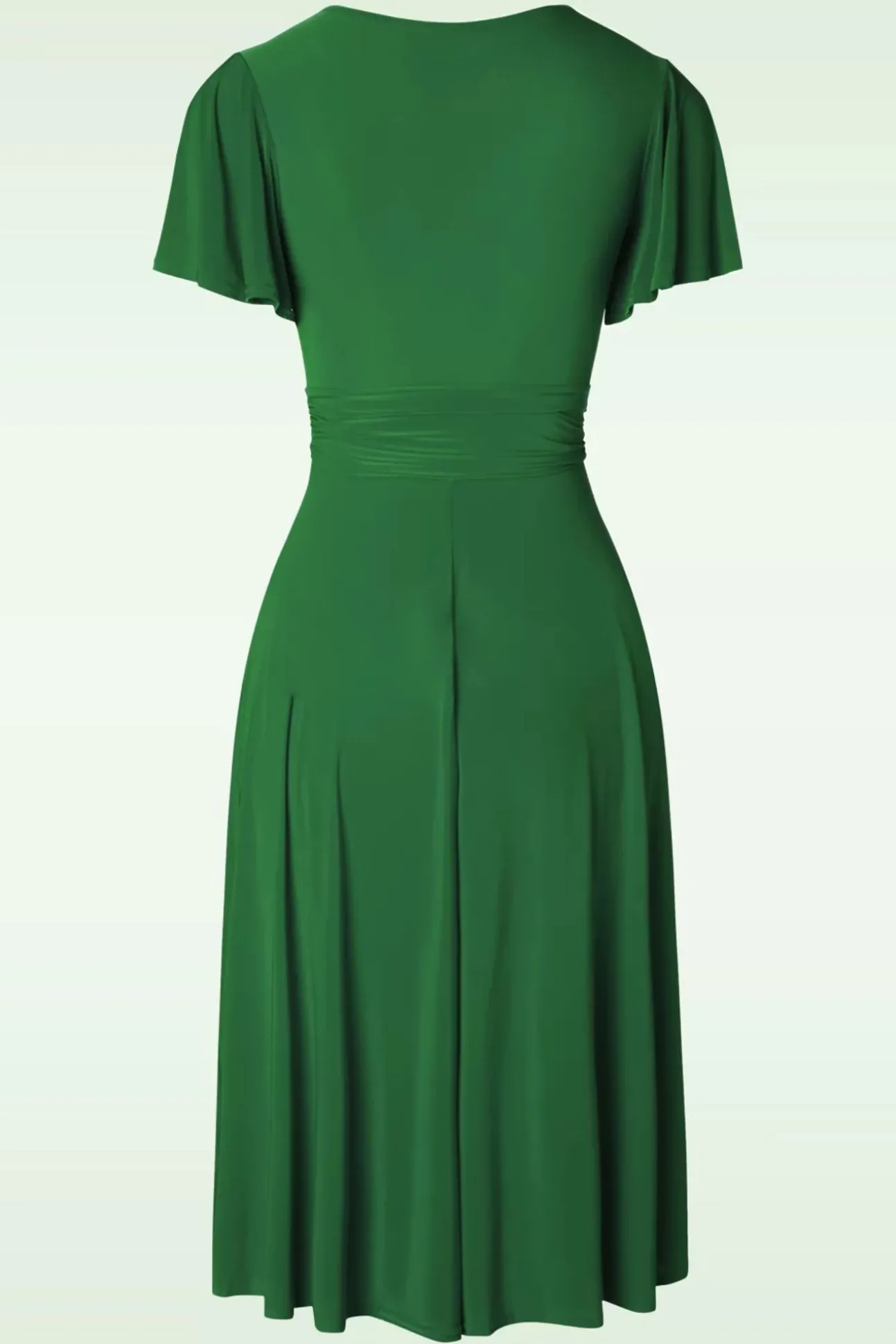 Flirt De Hele Dag In Deze 40S Irene Cross Over Swing Dress In Green! Wanneer Je Irene Aantrekt Weet Je Het Meteen; Ze Is Perfect! Ze Laat Je Op En Top Vrouw Voelen Door De Prachtige Aansluitende Overslag Top Met Een Sexy V-Halslijn, Speelse Strikbandjes Die Je Zowel Los Als Gestrikt Kunt Dragen En Haar Flatterende Plooien Aan De Zijkant. De Zwierige Vlindermouwtjes Geven Haar Een Flirty Touch Terwijl De Flatterende Semi-Swing Rok Zorgt Voor Een Flinke Portie Elegantie, Wow! Ze Is Uitgevoerd In Een Glad En Soepel, Licht Glanzend, Stretchy, Smaragdgroen Stofje Dat Garant Staat Voor Veel Kreukvrij Draagplezier. Irene Is Liefde, Pure Jurken-Liefde!