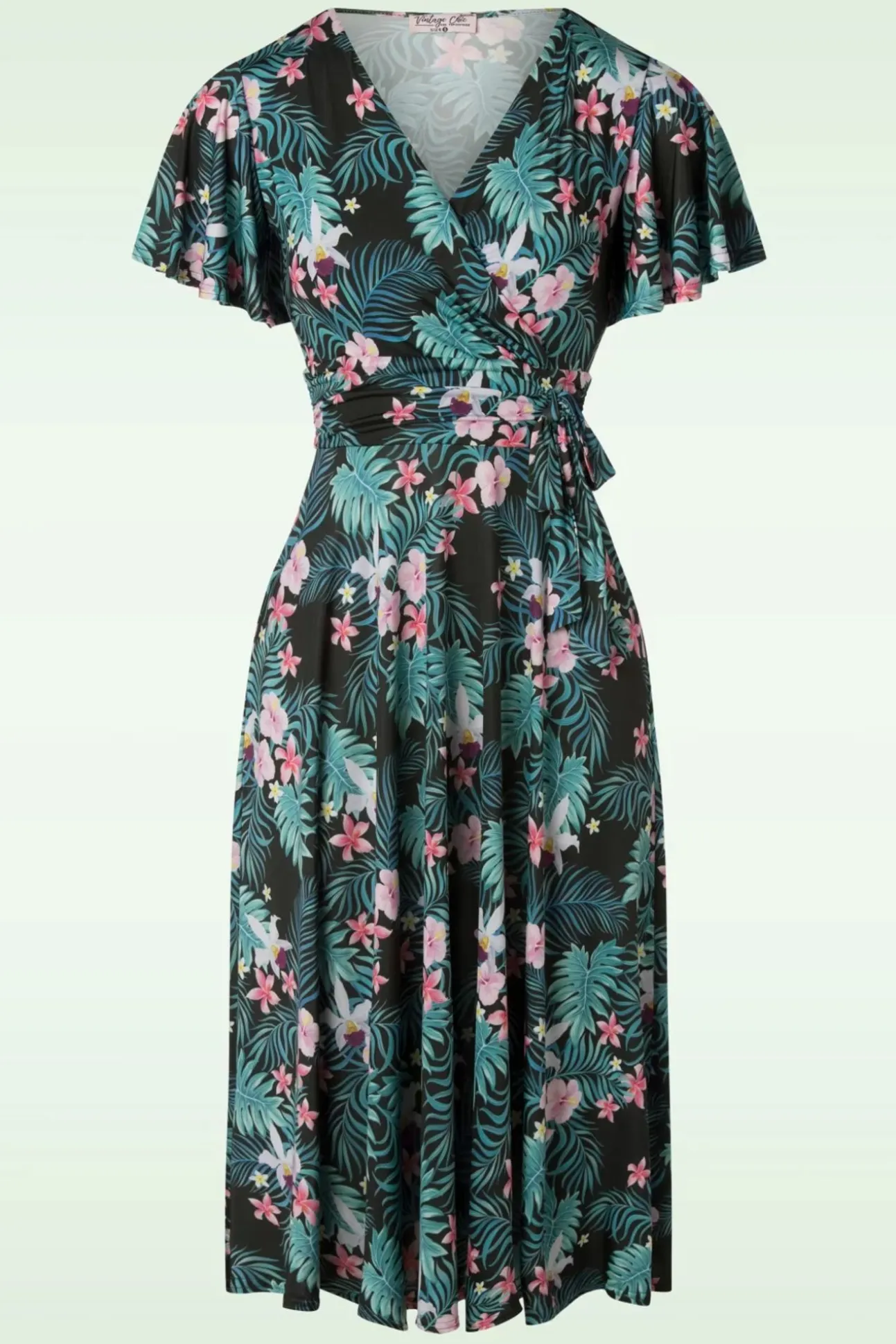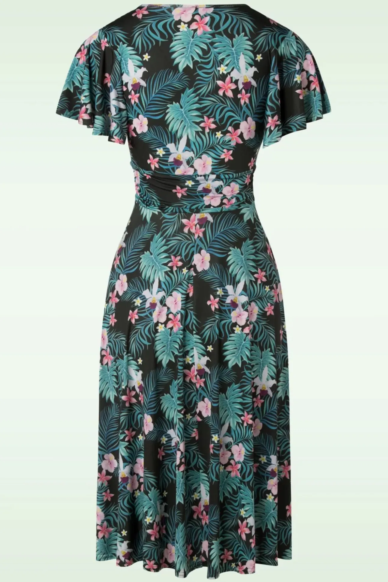 Deze 50S Irene Tropical Floral Cross Over Swing Dress In Black Is Een Echt Vintage Pareltje! Ze Heeft Een Prachtige Aansluitende Overslag Top Met Een Sexy V-Halslijn, Speelse Strikbandjes Die Je Zowel Los Als Gestrikt Kunt Dragen En Een Flatterende Geplooide Tailleband. De Zwierige Vlindermouwtjes Geven Haar Een Flirty Touch Terwijl De Flatterende Semi-Swing Rok Zorgt Voor Een Flinke Portie Elegantie, Wow! Ze Is Uitgevoerd In Een Glad En Soepel, Licht Glanzend, Stretchy Zwart Stofje Bezaaid Met Tropische Bloemen En Bladeren Dat Garant Staat Voor Veel Kreukvrij Draagplezier. Irene Is Liefde, Pure Jurken-Liefde!