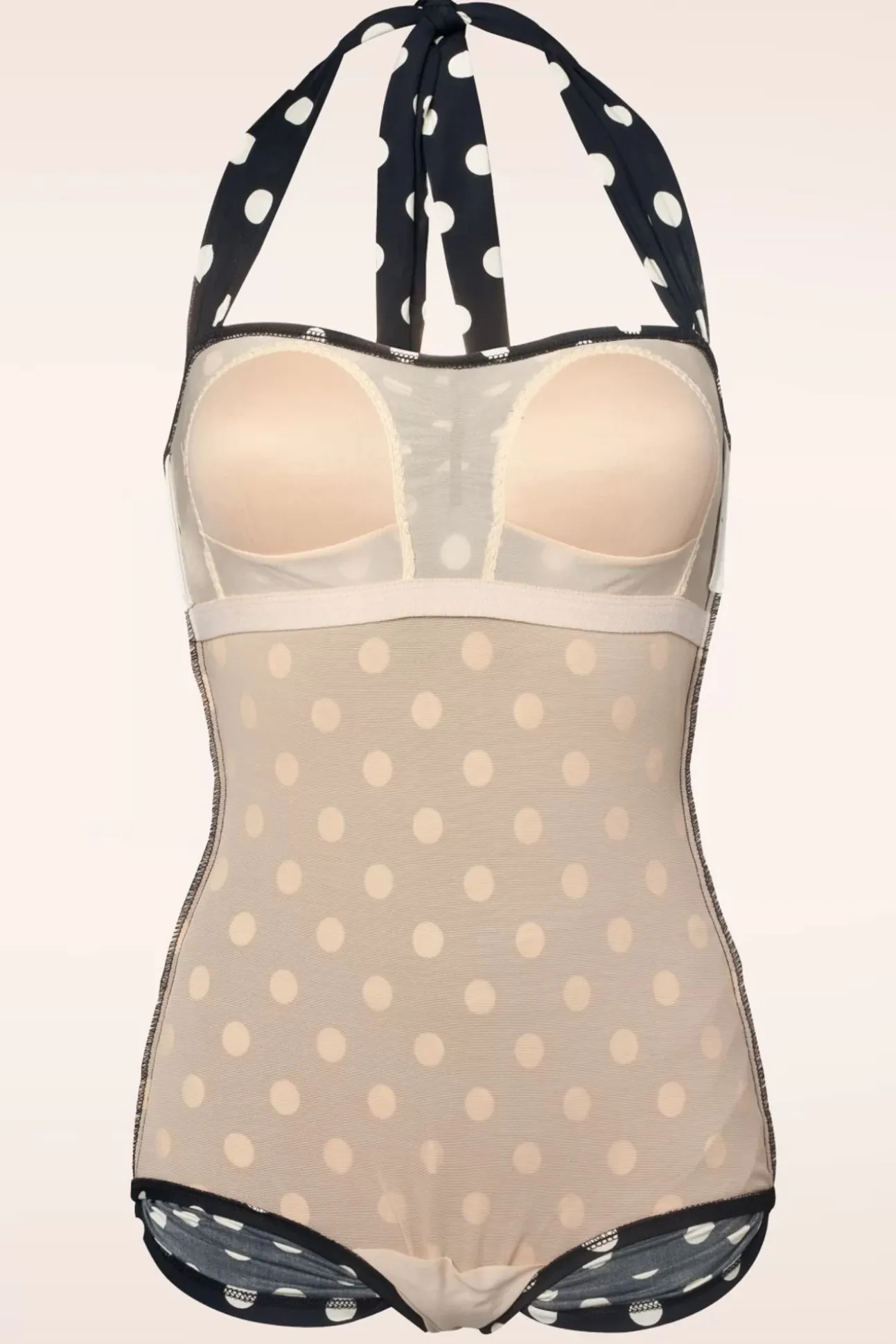 Dit 50S Classic Polkadot One Piece Swimsuit In Black And White Is Een Speels 50S Geïnspireerd Badpak! Dit Retro Schatje Heeft De Perfecte Pin-Up Uitstraling Door Haar Halter Top Met Geplooide Sweetheart Halslijn En Het Typische ‘Jurkje’ Met Geplooide Voorzijde Dat Enorm Flatteert. Geschikt Voor Alle Lichaamstypes Dankzij De Samenstelling Van De Stof En Het Slimme Design! Uitgevoerd In Een Stretchy, Zwart Stofje Met Een Witte Polkadotprint. Dit Schatje Mag Absoluut Niet In Je Vintage Swimwear Collectie Ontbreken!