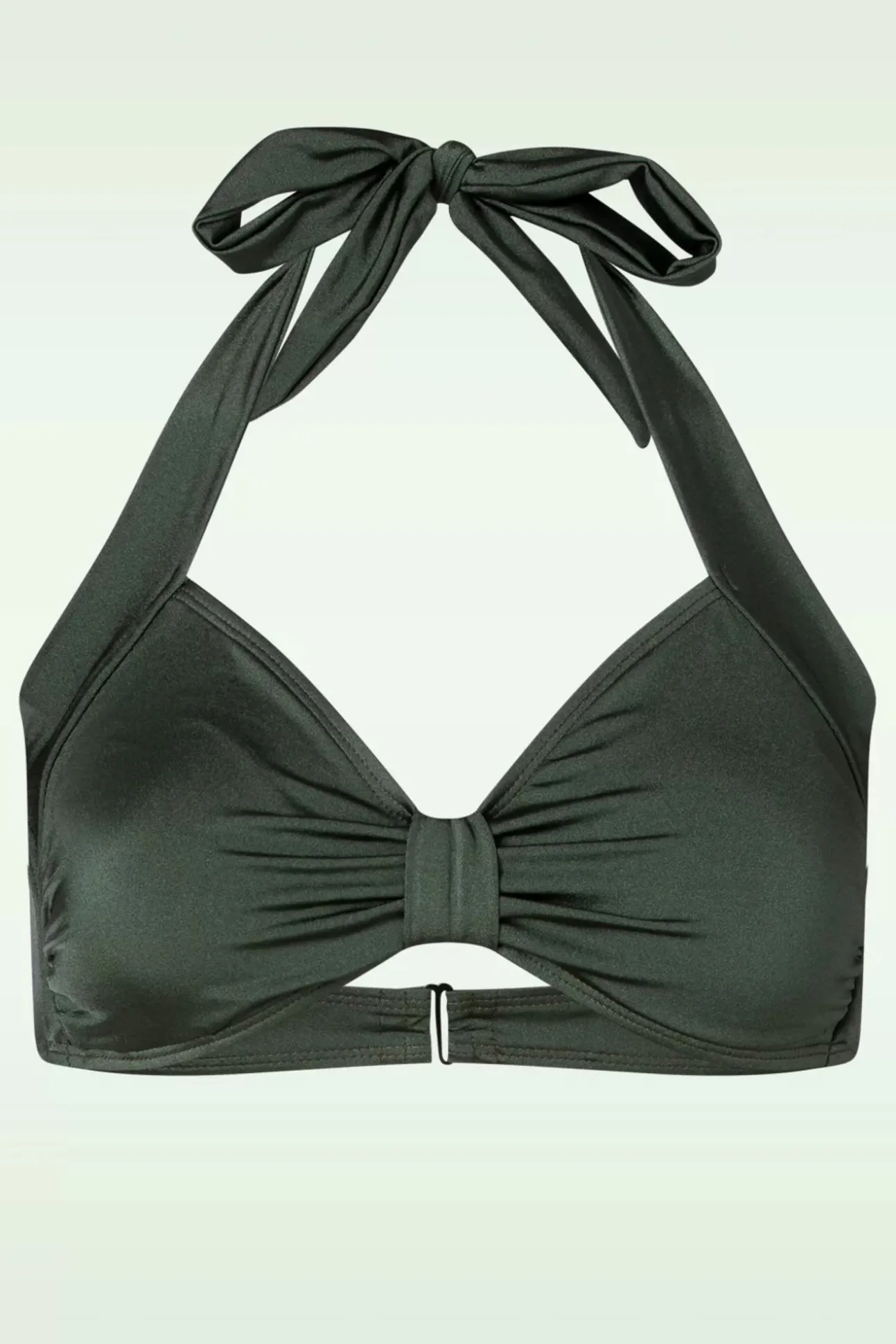 Deze Fantastische Classic Bikini Top In Dark Olive Heeft De Perfecte Vintage Pin-Up Uitstraling; Van Haar Halterbandjes Tot Aan Het Shiny Stofje. Deze Collectie Is Ontworpen Voor Echte Vrouwen En Is Passend Voor Vrijwel Elk Lichaamstype En Kleedt Ongelooflijk Af! Uitgevoerd In Een High Quality, Gladde, Glanzende Olijfgroene Stof Die Heerlijk Draagt En Voorzien Is Van Ingenaaide Soft Cups Met Verstevigde Baleinen Aan De Zijkant. Niet Enkel Om Te Flaneren, Maar Uiteraard Ook Geschikt Voor Een Frisse Duik Zonder Zorgen 😉