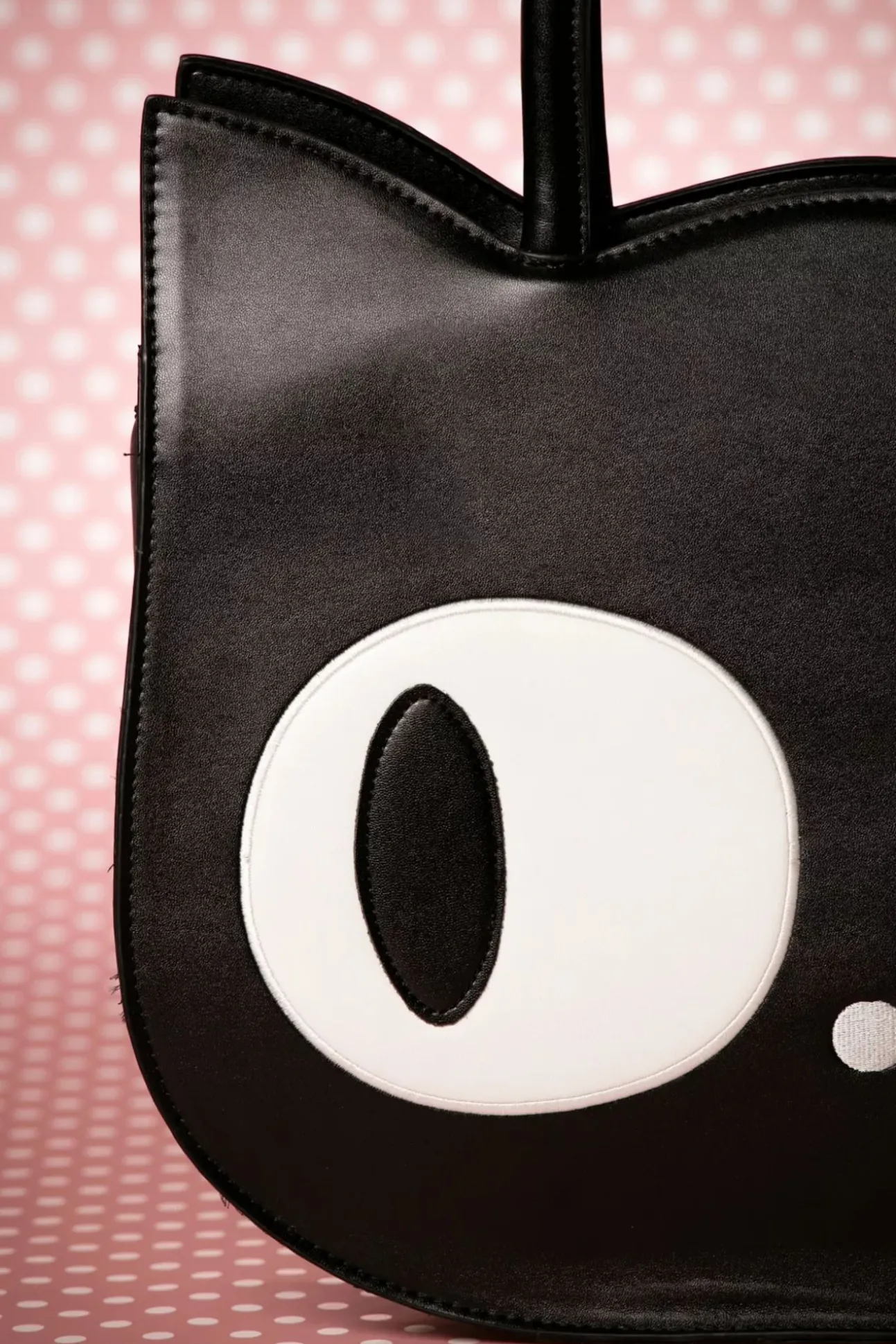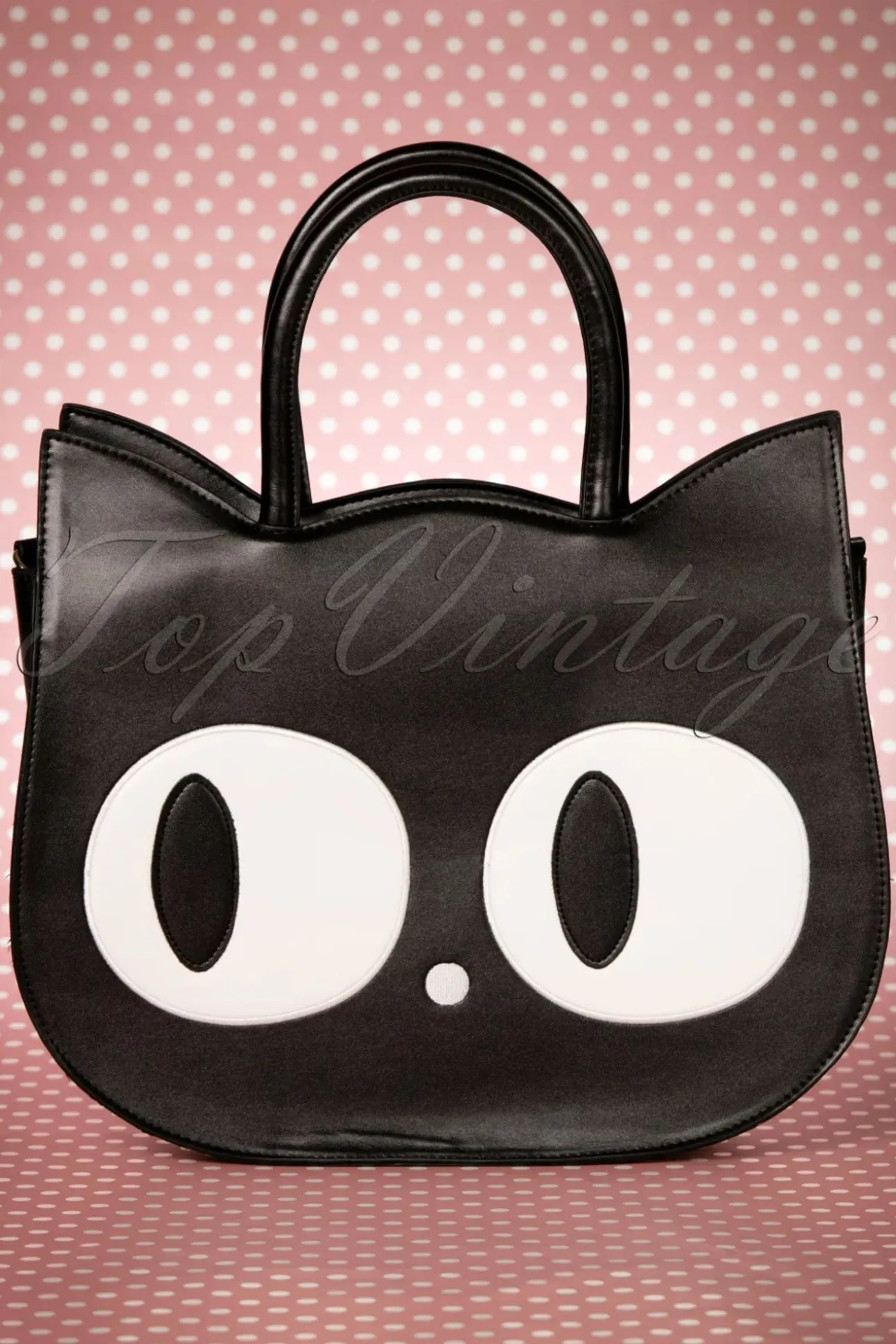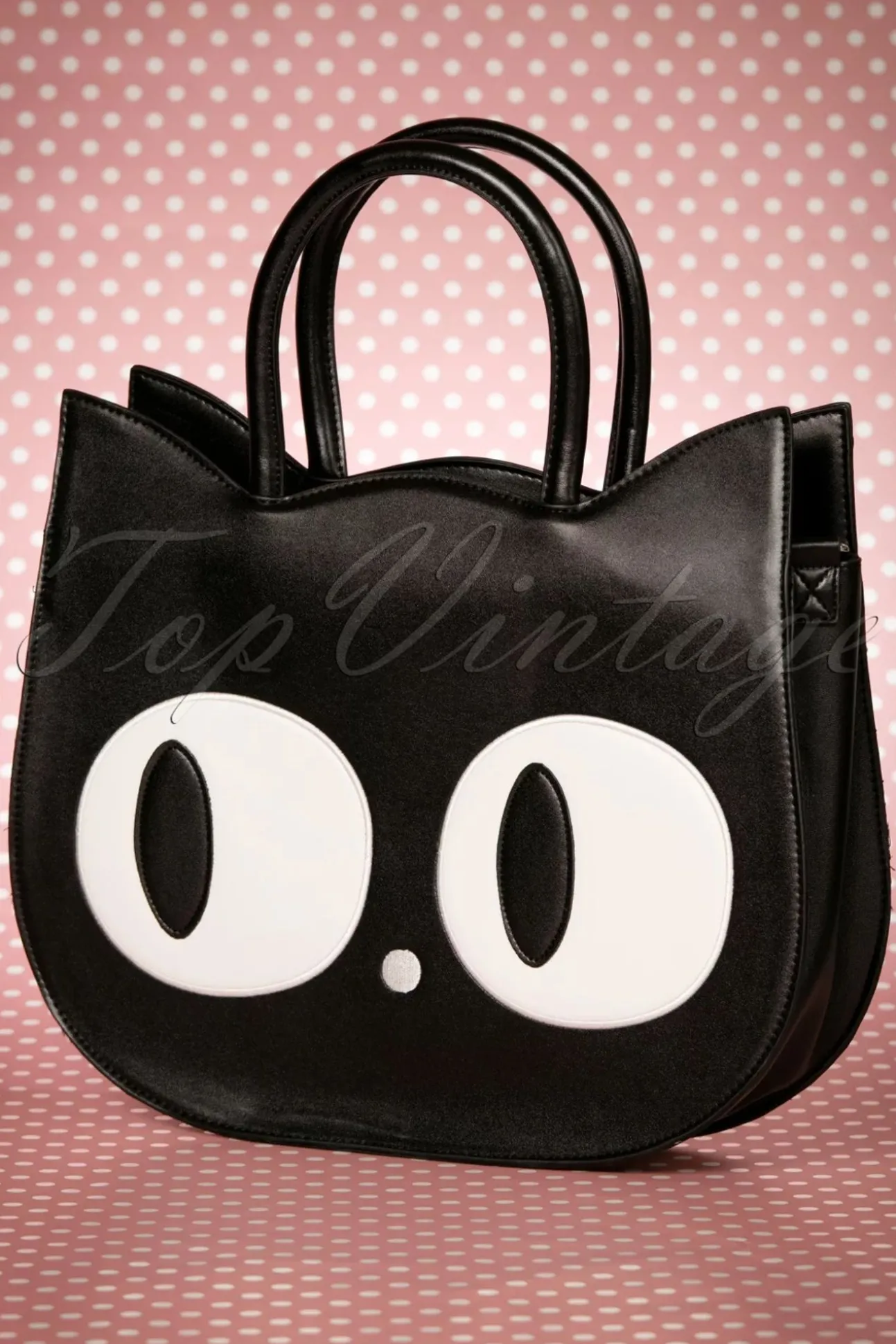 De 60S Lizzy The Big Eyed Cat Bag Is Een Speelse Tas En Een Echte Eyecatcher! ”Look Into My Gorgeous Eyes!” Deze Geweldige Oversized Tas Is Uitgevoerd In Zwart ‘Faux’ Leder In De Vorm Van Een Kattengezicht Met Prachtige Grote Ogen, Een Gestikt Neusje En Als Schattig Detail, Een Gestikt Kattenpootje Op De Achterzijde! Met Deze Tas Zal Jij Beslist Iedereen Om Je Heen Hypnotiseren! 😉