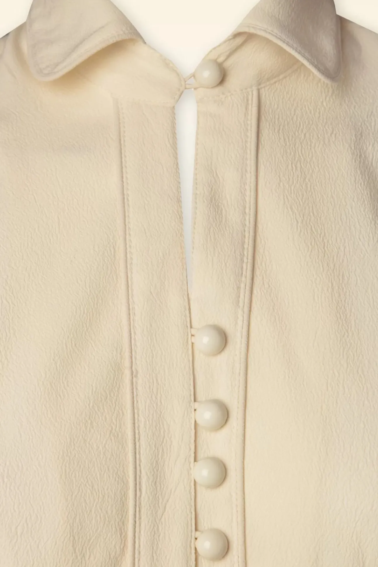 Deze 50S Margot Blouse In Antique White Is Een Echte Klassieker! Ze Is Voorzien Van Een Schattig Peter Pan Kraagje, Korte Pofmouwen En Een Reeks Knopen. Je Kunt Haar Met Een V-Hals Of Hooggesloten Dragen Dankzij Het Knoopje Bij De Kraag. Uitgevoerd In Eensoepele, Crêpe-Achtige, Ivoorwitte Stof (Stretcht Niet) Die Heerlijkdraagt. Combineer Haar Met Een Pencil Rok Of Een High Waist Broek Met Wijdepijp Voor Een Classy 50S Stijl!