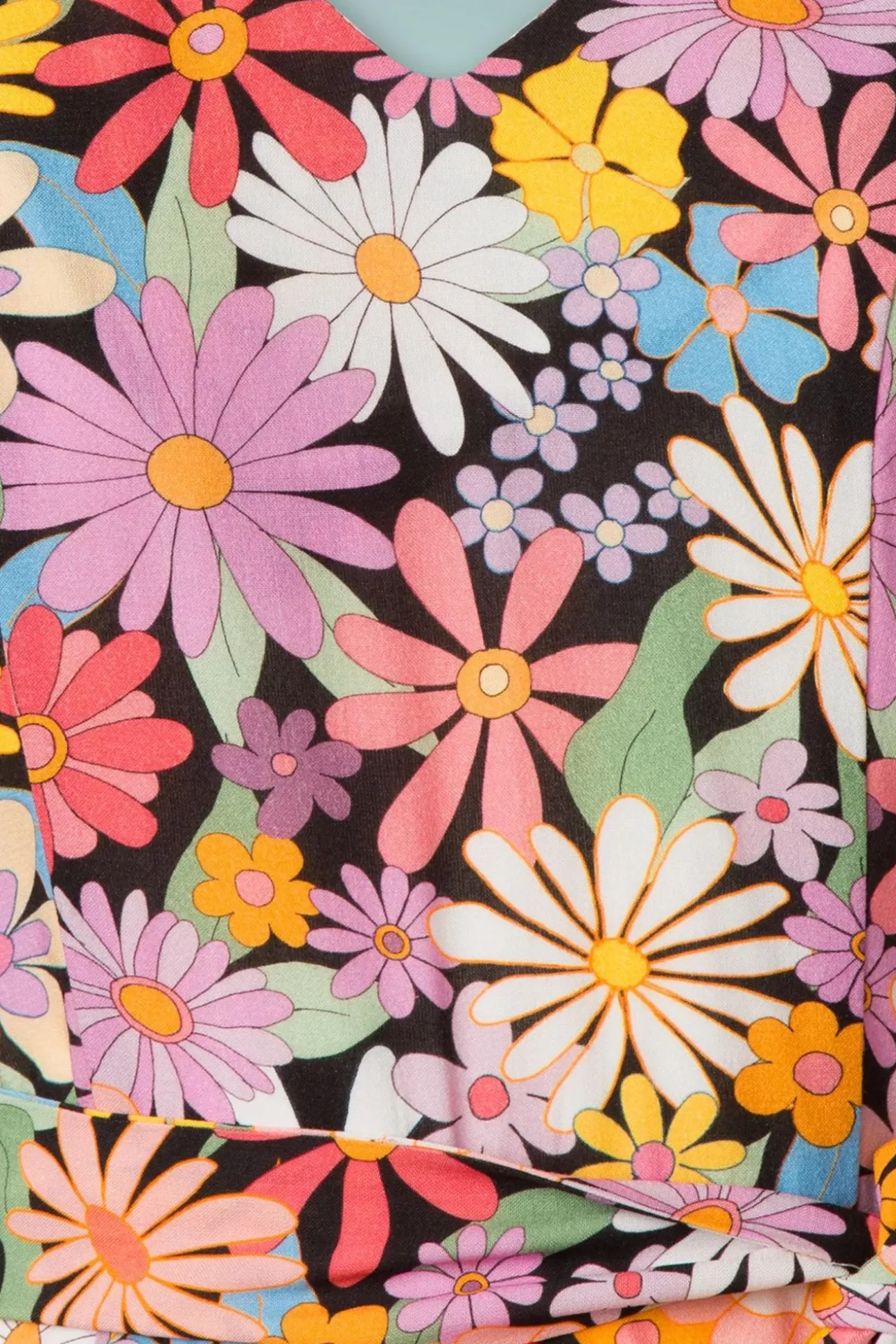 Let’s Get Groovy Met Deze 70S Nadine Flower Jumpsuit In Multi! Ze Heeft Een V-Halslijn, 1/2 Flared Mouwen, Een Strikband Waarmee Jij Je Taille Perfect Accentueert En Flatterende, Wijde 7/8 Pijpen. Uitgevoerd In Soepel En Luchtig 100% Viscose Met Een Kleurrijke Retro Bloemenprint. ”Flower Power, Every Minute, Every Hour!”