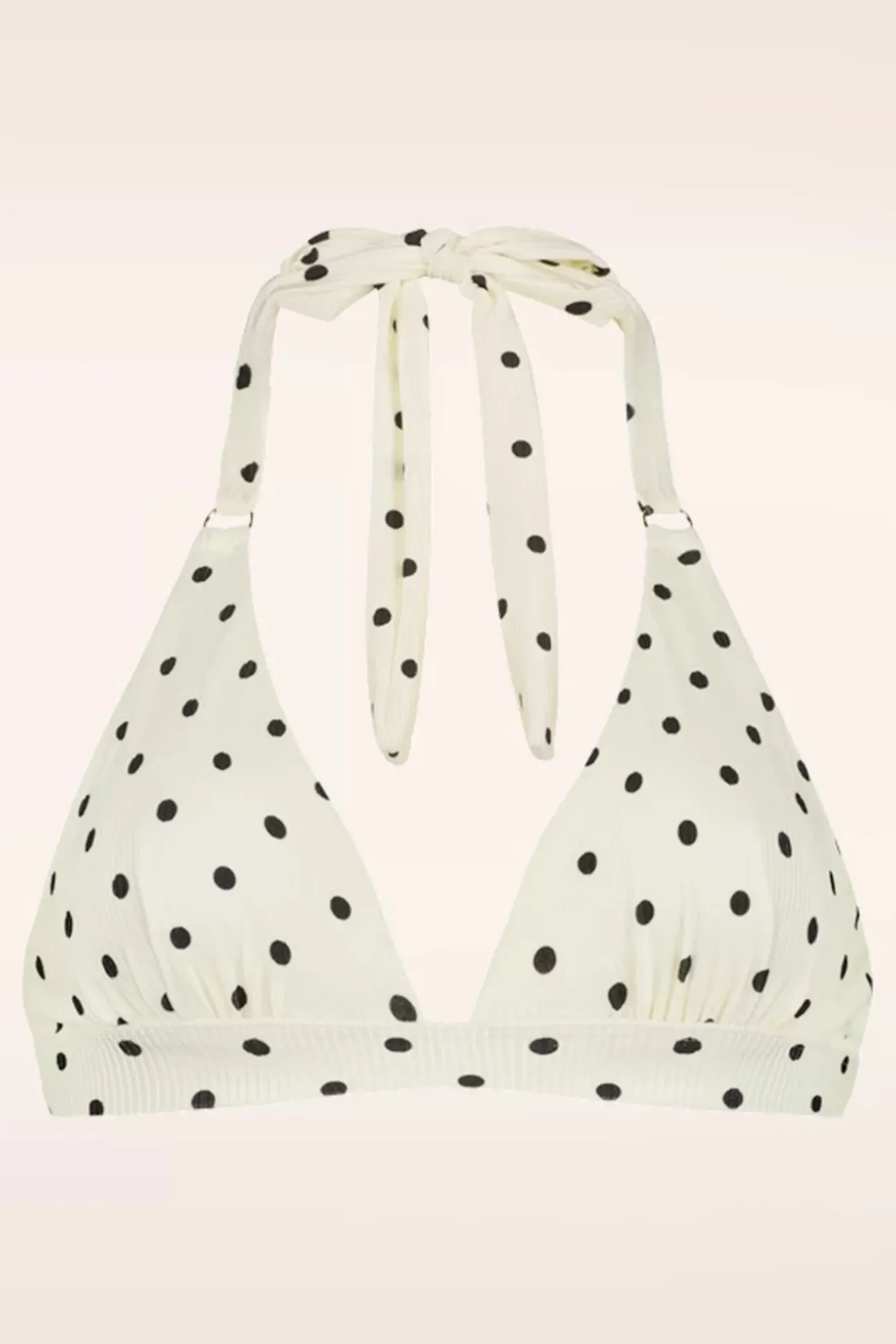 Met ‘stip’ Op Nummer 1 Dit Seizoen! 😉 Deze Halter Bikini Top Is Voorzien Van Padded Cups Die Je Voorzien Van Een Prachtig Decolleté. Afgewerkt Met Plooitjes En Uitgevoerd In Een Comfy, Perfect Aansluitend Ivoorwit Stofje Met Een Mooie Glans En Een Print Van Zwarte Polkadots.