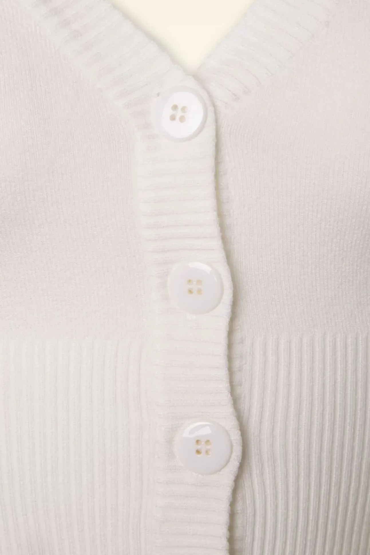 De 50S Overload Cardigan Is Een Echte Klassieker! Classy In Al Haar Eenvoud En Daardoor De Perfecte Match Met Al Jouw Vintage Kledingstukken! Deze Korte Cardi Heeft Een Elegante V-Halslijn, 1/2 Mouwen En Grote Glimmende Knopen. Uitgevoerd In Een Fijngebreide, Ivoorwitte Viscosemix Met Een Heerlijke Stretch Voor Een Mooie Aansluitende Pasvorm. De Combinatiemogelijkheden Zijn Eindeloos!