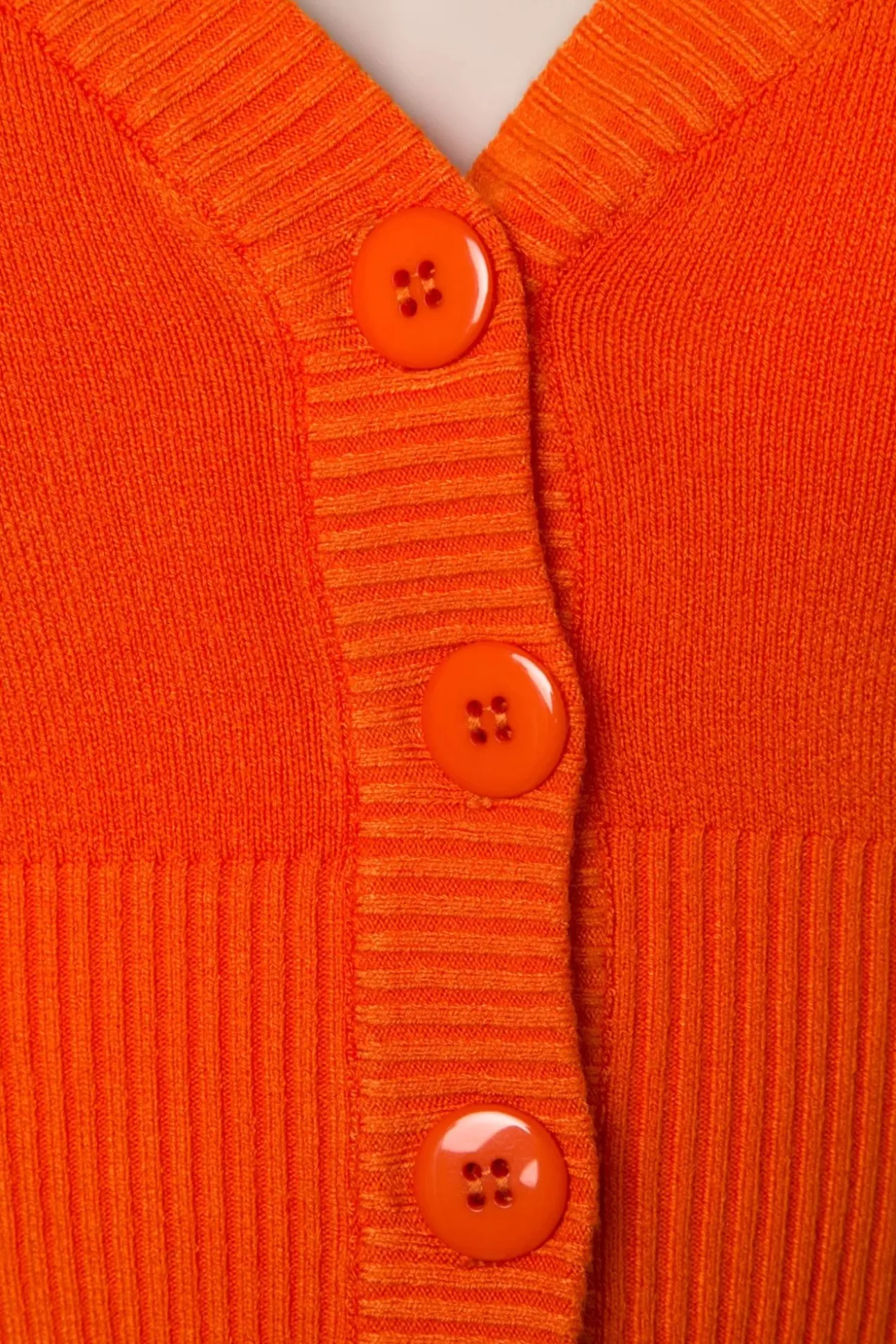 De 50S Overload Cardigan Is Een Echte Klassieker! Classy In Al Haar Eenvoud En Daardoor De Perfecte Match Met Al Jouw Vintage Kledingstukken! Deze Korte Cardi Heeft Een Elegante V-Halslijn, 1/2 Mouwen En Grote Glimmende Knopen. Uitgevoerd In Een Fijngebreide, Oranje Viscosemix Met Een Heerlijke Stretch Voor Een Mooie Aansluitende Pasvorm. De Combinatiemogelijkheden Zijn Eindeloos!
