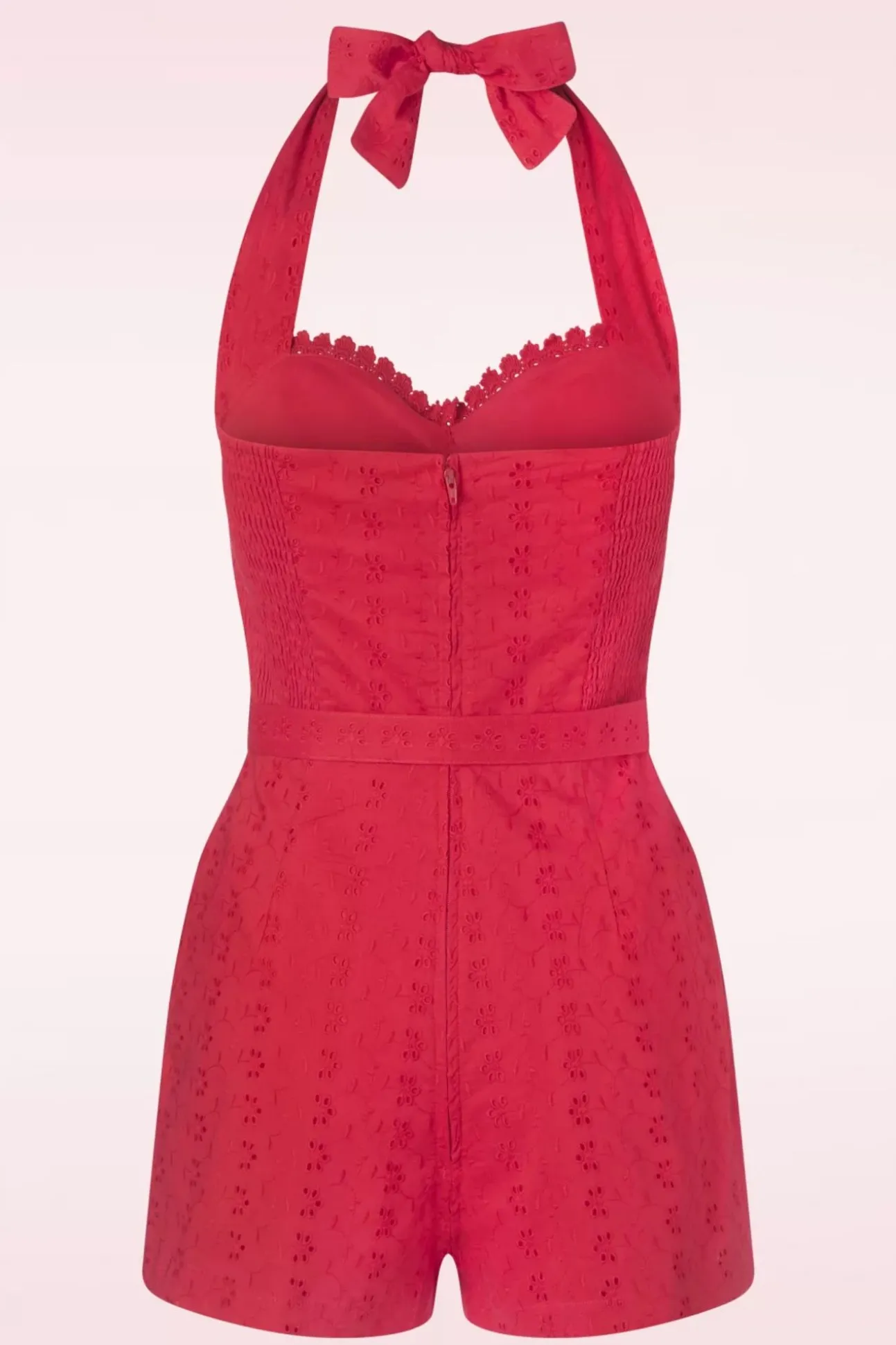 “All I Need In The Summer Is A Killer Playsuit And Some Fancy Sandals.” Raven Is Uitgevoerd In Een Rode, Broderie Kanten, 100% Bio Katoen (Stretcht Niet) En Is Volledig Gevoerd Waardoor Ze Heerlijk Luchtig Draagt Tijdens Warmere Dagen.
