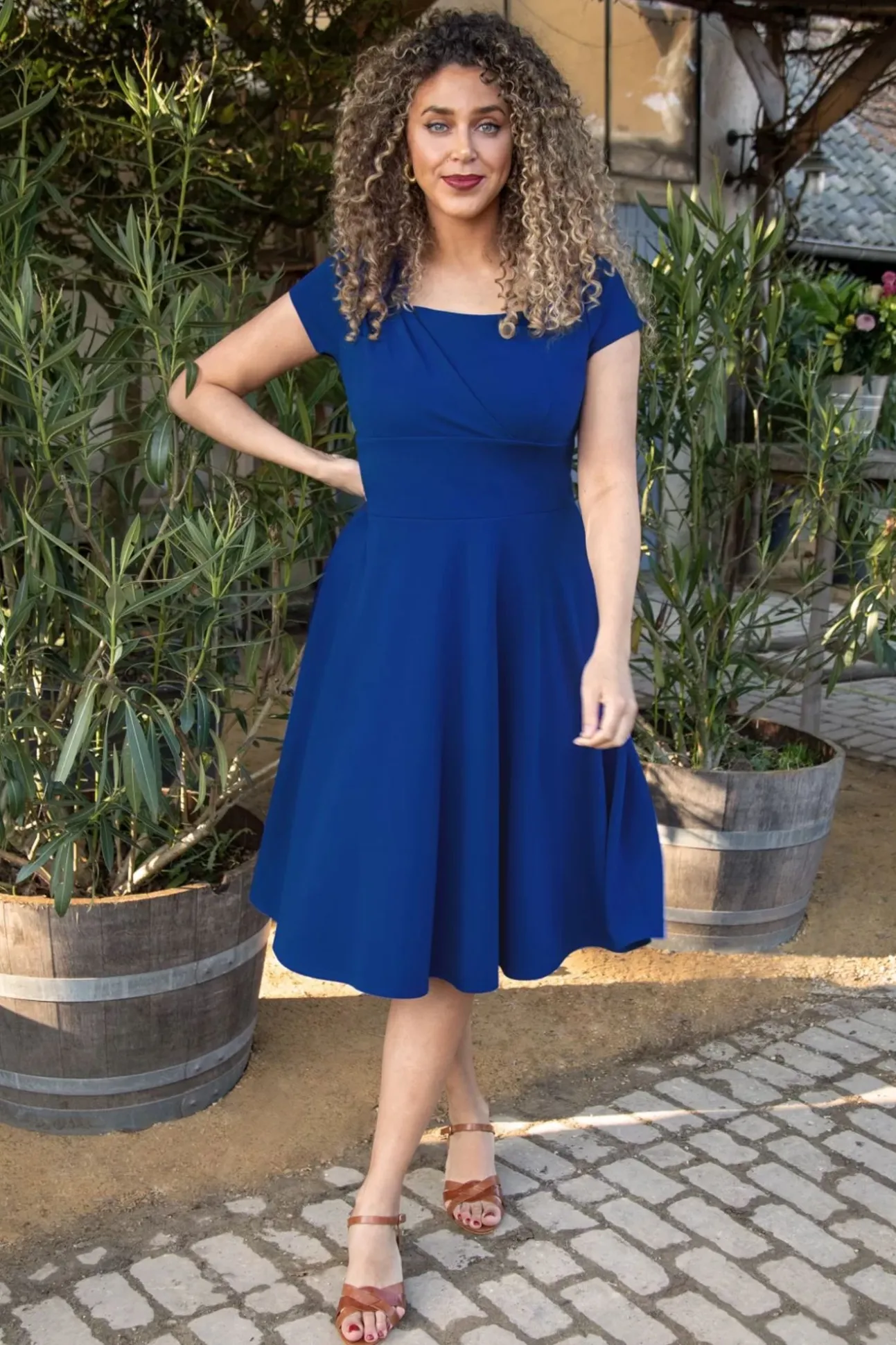 ”No More Blue Mondays” Met Deze 50S Riyana Swing Dress In Royal Blue! Deze Droomjurk Heeft Een Vierkante Halslijn, Elegante Geplooide Details En Korte Mouwen. Vanaf De Taille Loopt Ze Uit In Een Zwierige Swing Rok Waardoor Er Een Super Vrouwelijk Silhouet Ontstaat. Uitgevoerd In Een Soepele En Stretchy, Koningsblauwe Stof Die Heerlijk Draagt. Riyana Laat Je Dansen Van Geluk!