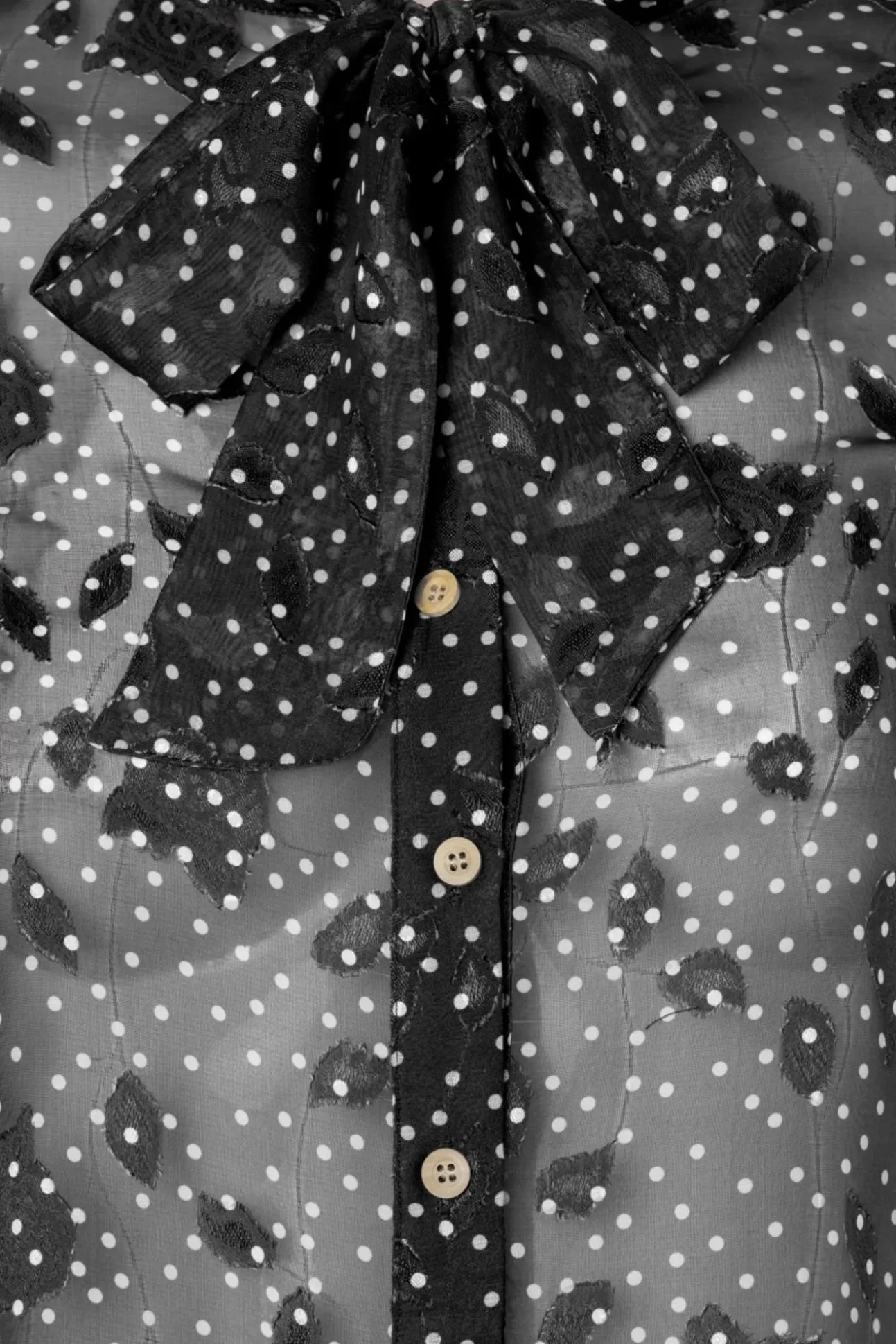 Creëer De Meest Prachtige Looks Met Deze 50S Rose Pussy Bow Blouse In Zwart! Ze Heeft Een Vaste Strikbanden Bij De Halslijn, Lange Mouwen Met Manchetten En Een Reeks Houten Knopen. Uitgevoerd In Een Soepel, Semi-Doorschijnend Zwart Stofje (Stretcht Niet) Bezaaid Met Witte Dotjes En Voorzien Van Een Glanzend Rozenpatroon. Ben Jij Al Verliefd?