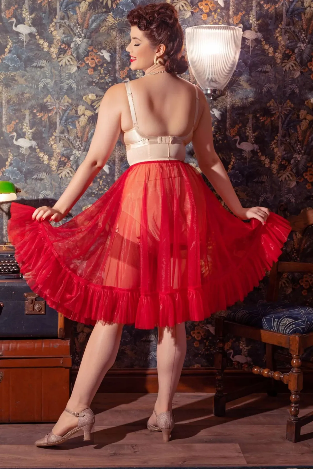 ”swish And Swirl!” Deze Petticoat Heeft Één Laag, Is Uitgevoerd In Rood Doorzichtig Mesh Met Een Franje Aan De Onderzijde En Is Afgewerkt Met Een Elastische Tailleband.