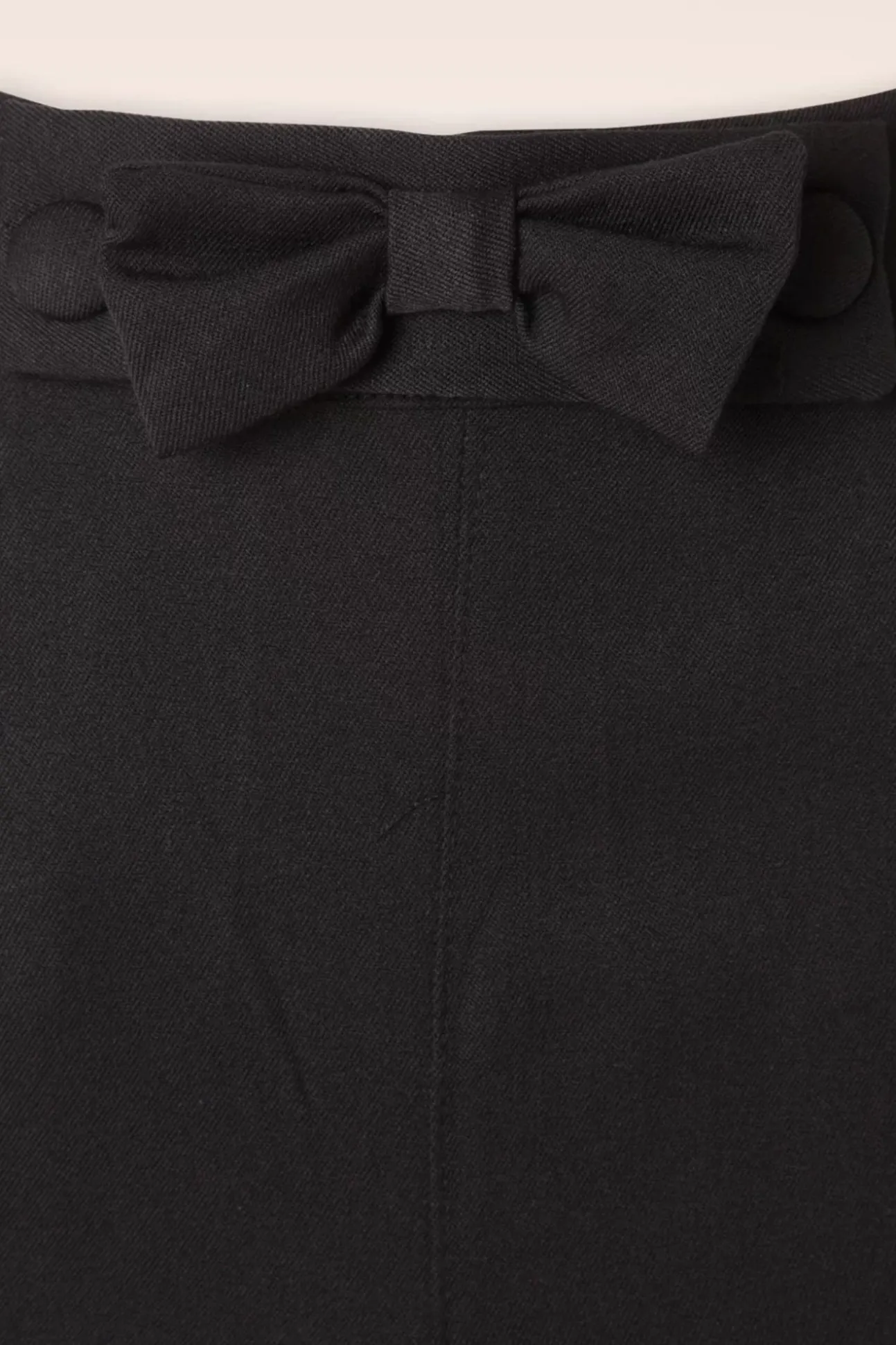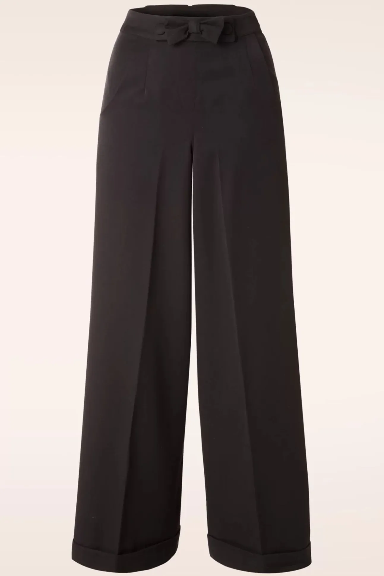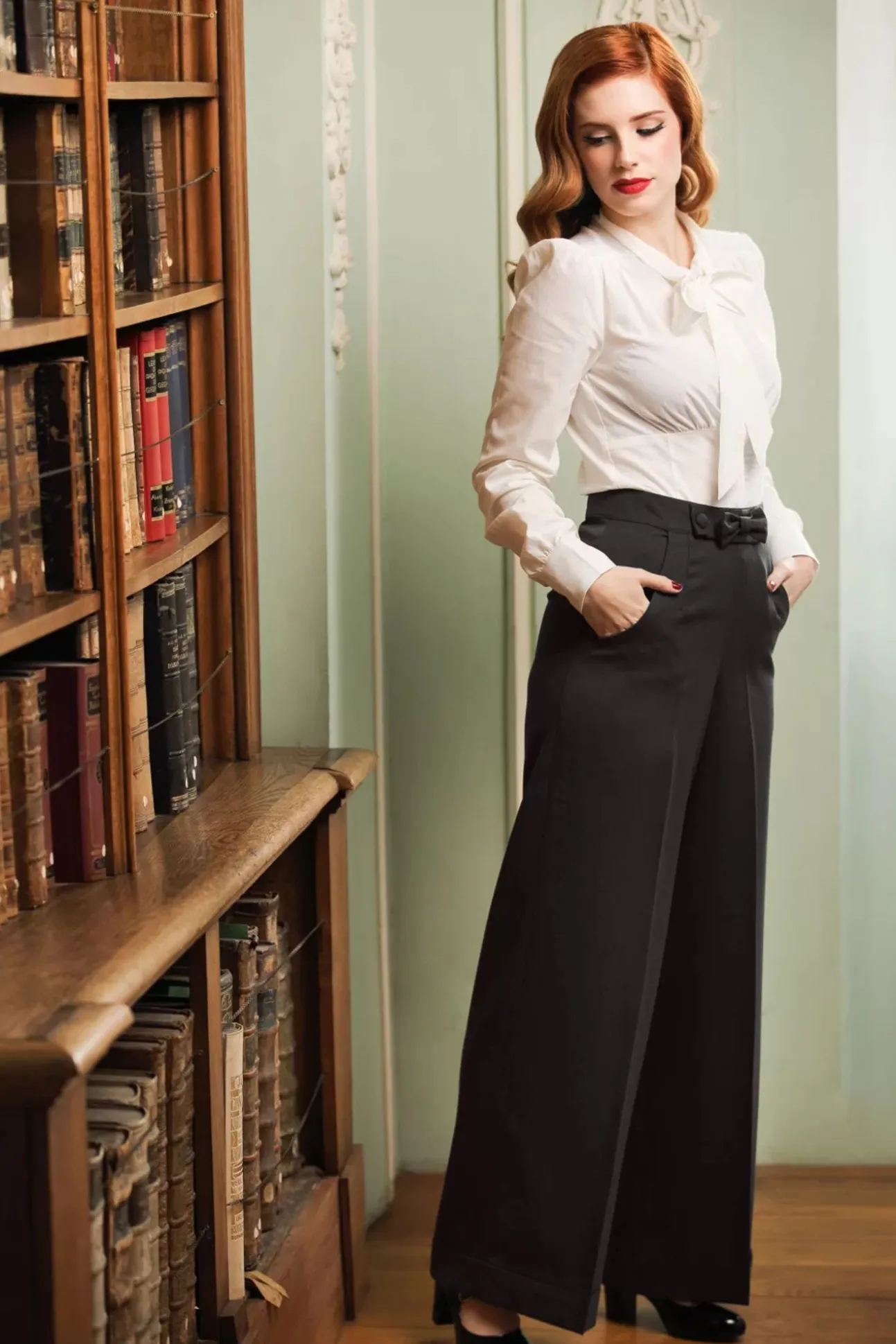 De 40S Hidden Away Trousers In Black Is Geïnspireerd Op De Pantalons Die De Vooruitstrevende Dames In De Jaren 40-50 Droegen! De Vrouwelijke Hoge Taille Vormt Een Mooi Contrast Met De Wijde Pijp En Heeft Een Super Afkledend Effect, Ook Als Je Vollere Heupen/Billen Hebt. Het Zwarte Strikje En Knoopdetail Aan De Achterzijde Maken Het Geheel Helemaal Af. Uitgevoerd In Een Soepel Vallend, Licht Stretchy Stofje In Een Klassieke Zwarte Kleur En Afgewerkt Met Een Chique Omslagje Bij De Pijpen. Combineer Met Een Witte Blouse En Pumps Voor De Perfecte Zakelijke Look In Retro Stijl!